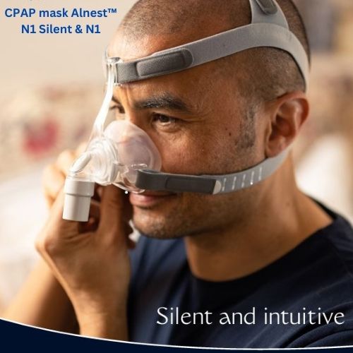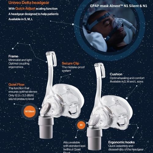 Masca CPAP Alnest™ N1 este ușor de montat și de reglat, este o mască nazală minimalistă concepută pentru a oferi confort maxim, stabilitate și ușurință în utilizare. Curele universale cu repere modificabile prin ajustare rapidă (Curele universale Univeo™ Delta), fiind varianta de mască CPAP cu pierderi de aer standard (fără flux silențios). Alnest™ N1 este fabricată în Franța de Air Liquide Medical Systems.